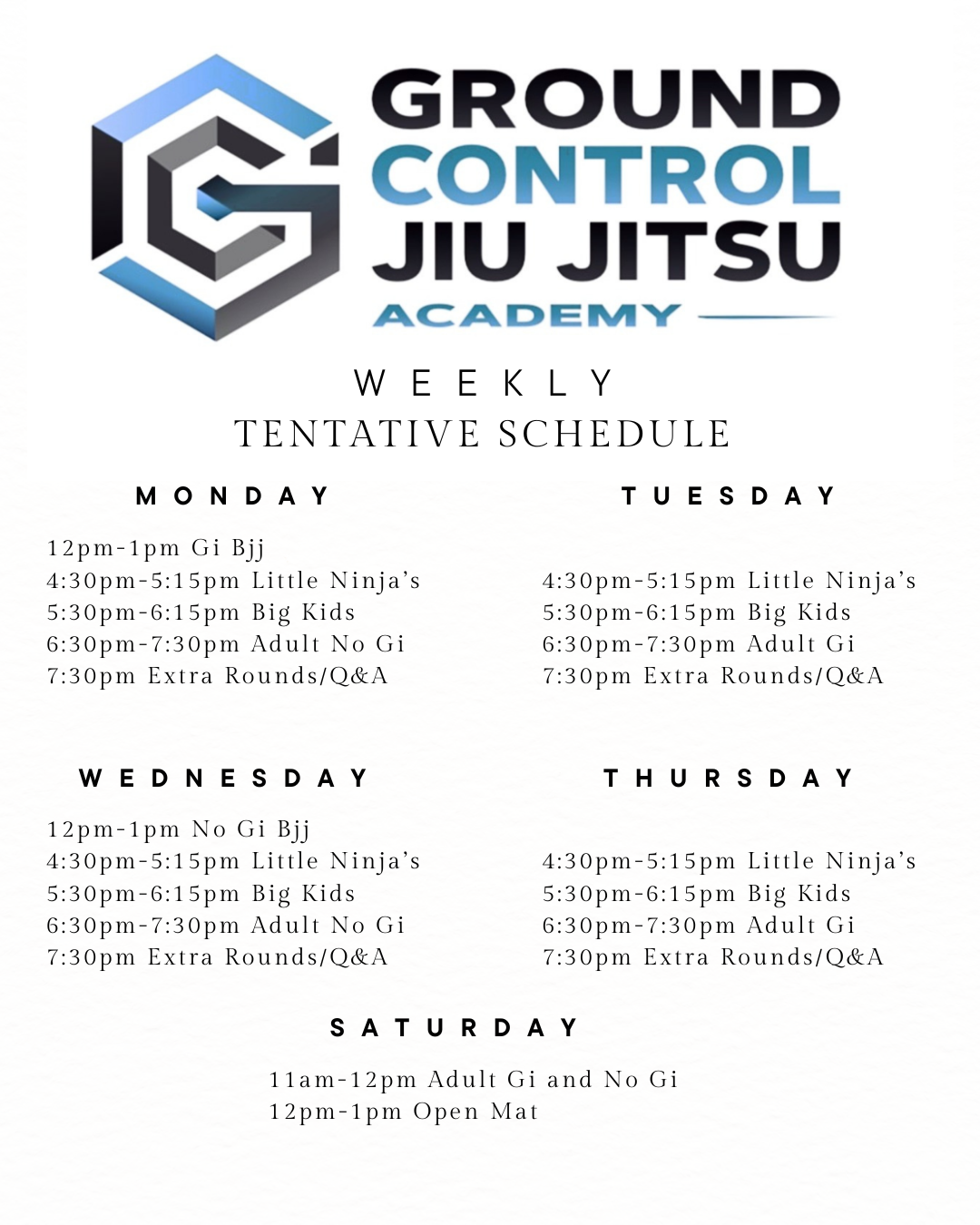 From Gi and No Gi to kids classes and open mat, find a schedule that helps you train regularly and keep improving.